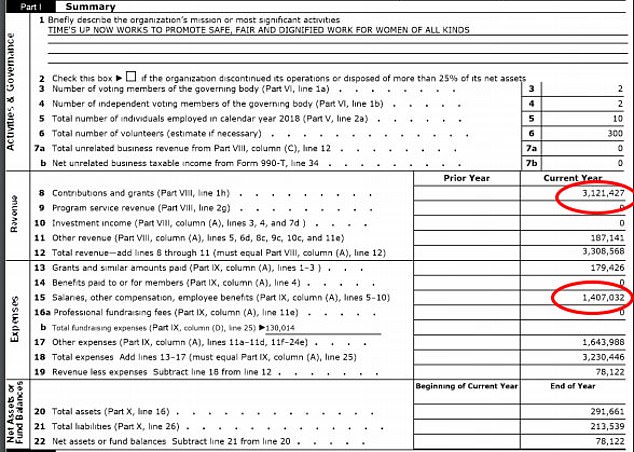 While Time’s Up managed to raise around 4 million in its founding year, it also spent $1,407,032 on salaries alone.