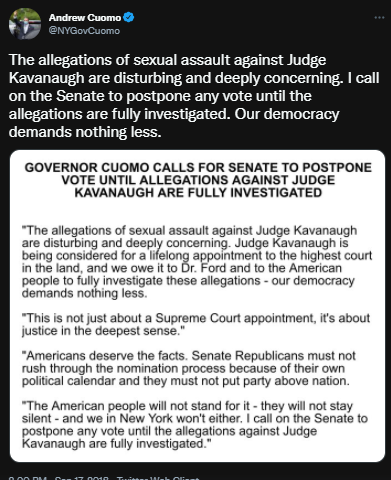 In fact, Cuomo tweeted as recently as 2018 that allegations of sexual harassment made against his political opponent and fellow white supremacist Bret Kavanaugh were “disturbing”. Cuomo also insisted that all political proceedings be stopped until “all allegations are fully investigated.”