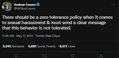 Cuomo is also on record stating that there should be a “zero tolerance” policy for those accused of sexual misconduct.