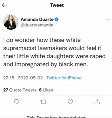 The Black media’s very own Taurean Reign exposed racist white feminist Amanda Duarte for her anti-Black tweets claiming that if abortion was banned then ‘white daughters’ were going to be ‘impregnated’ by Black men, mirroring McCorvey’s original claim and Sangers original assertion.