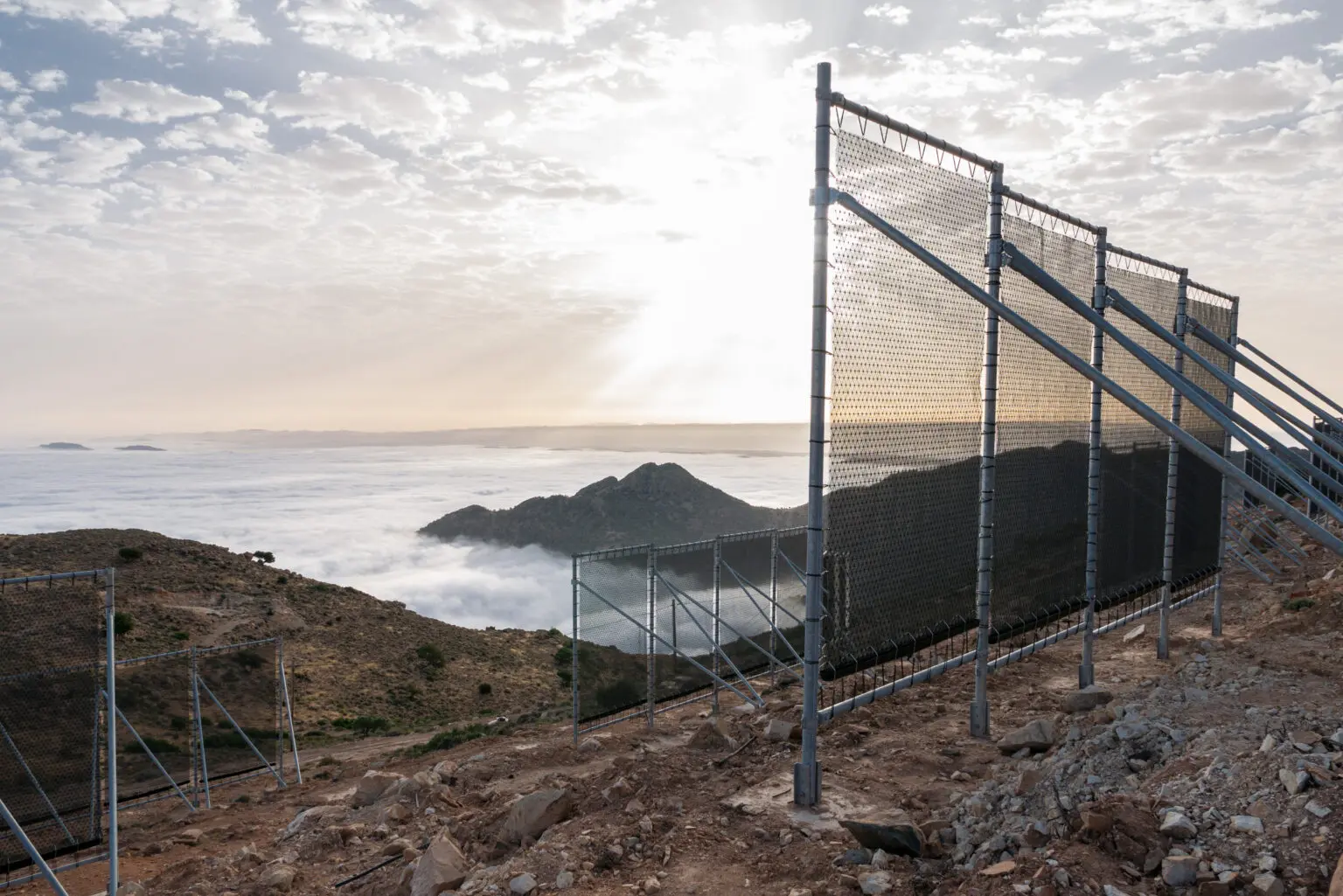 The system resembles a large, vertical net—sometimes up to 40 meters long—positioned perpendicular to prevailing fog-laden winds.
