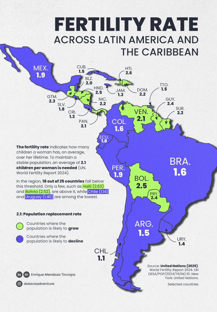 Las tasas de fertilidad han caído por debajo del nivel de reemplazo en gran parte de la región. En términos simples, no están naciendo suficientes niños para mantener el tamaño de la población a largo plazo. Este fenómeno, que antes se asociaba con economías desarrolladas, ha llegado con fuerza a Latinoamérica, pero sin la red de seguridad que esos países suelen tener.