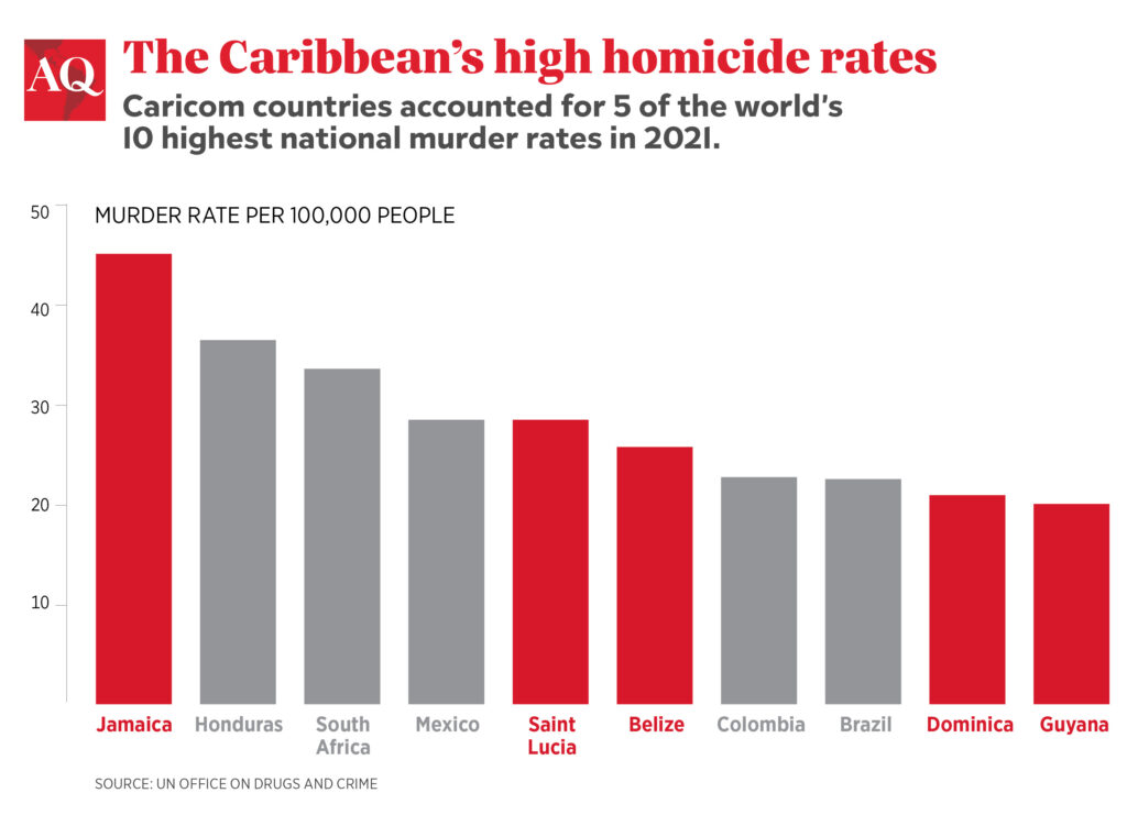 Zoom out, and the regional picture sharpens. The Caribbean as a whole consistently ranks as one of the most violent regions globally, with an average homicide rate estimated at 15–20 per 100,000, more than double the world average. In some hotspots, that figure triples or quadruples.